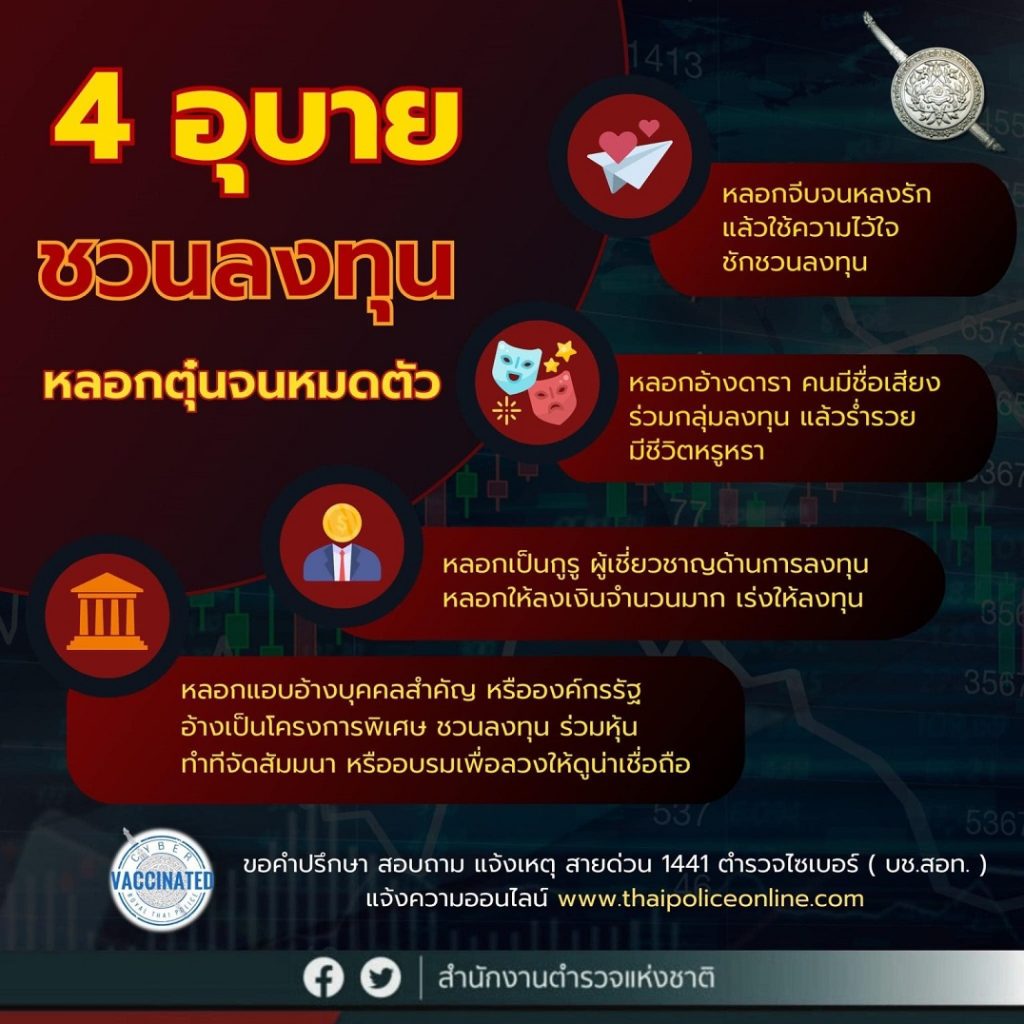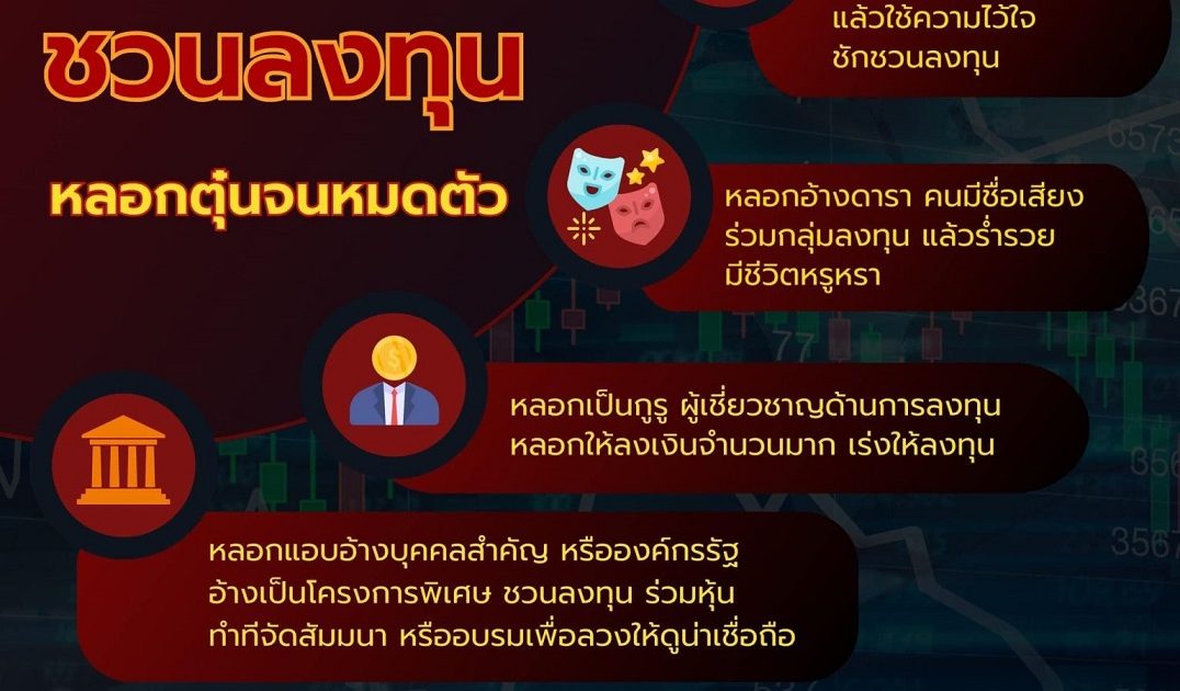 ข้อสังเกตสำคัญ : มิจฉาชีพมักโฆษณาชวนเชื่อว่าการลงทุนนั้นทำได้ง่าย ล่อใจด้วยผลตอบแทนสูง หรือยอมให้ผลตอบแทนคืนมาให้ในครั้งแรก ๆ จากนั้นจะโน้มน้าวให้ลงทุนเพิ่มขึ้นเรื่อย ๆ ล่อใจด้วยกำไรมหาศาล ซึ่งไม่เป็นความจริง จากนั้นจะเริ่มไม่ได้รับผลตอบแทน โดยมิจฉาชีพจะมีข้ออ้างสารพัดบ่ายเบี่ยงไม่ให้เงินคืน บางรายหนีหายไปเลย
