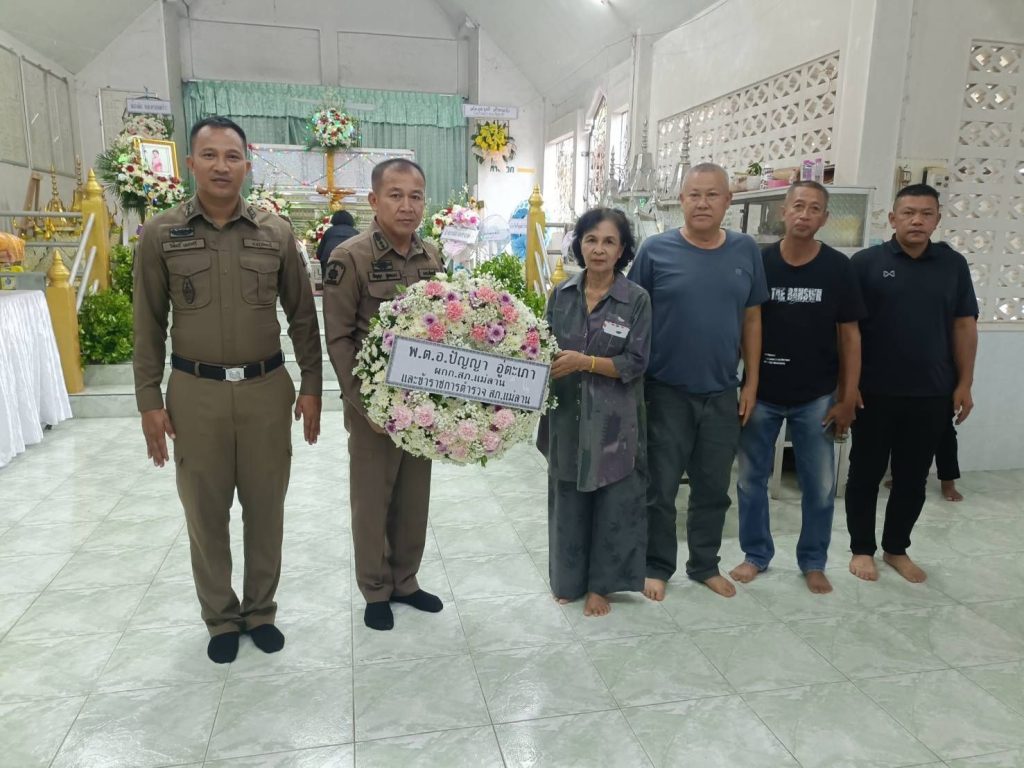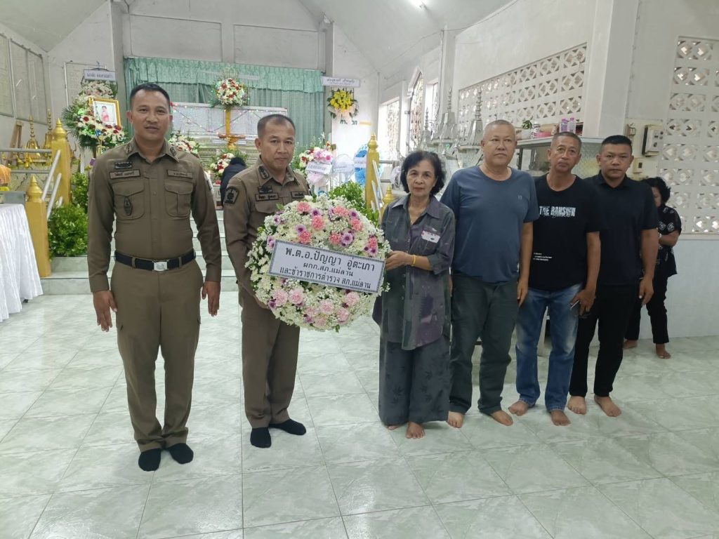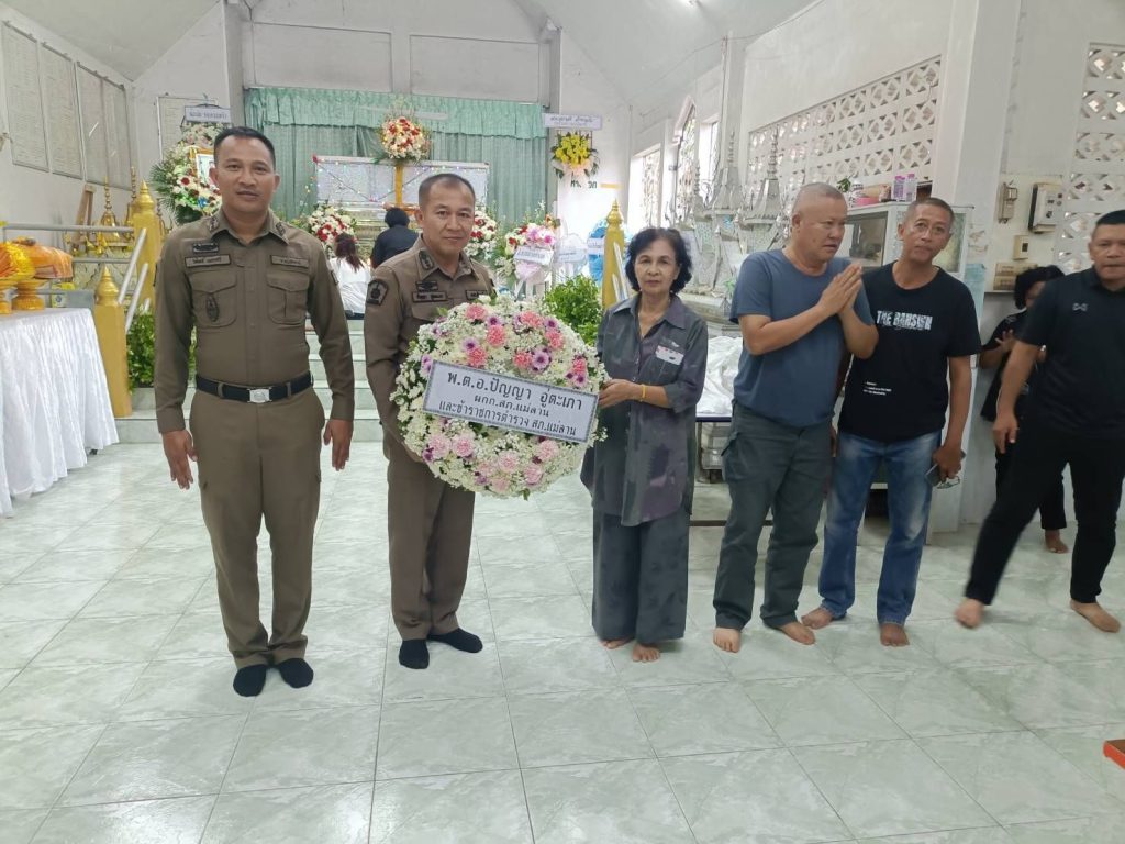 ร่วมแสดงความอาลัย มอบพวงหรีด และเงินทำบุญงานบำเบ็ญกุศลศพ ประชาชนบริเวณร้านค้าหน้าสถานี ซึ่งมีความคุ้นเคยกับตำรวจแม่ลาน ณ วัดป่าสวยต.แม่ลาน อ.แม่ลาน