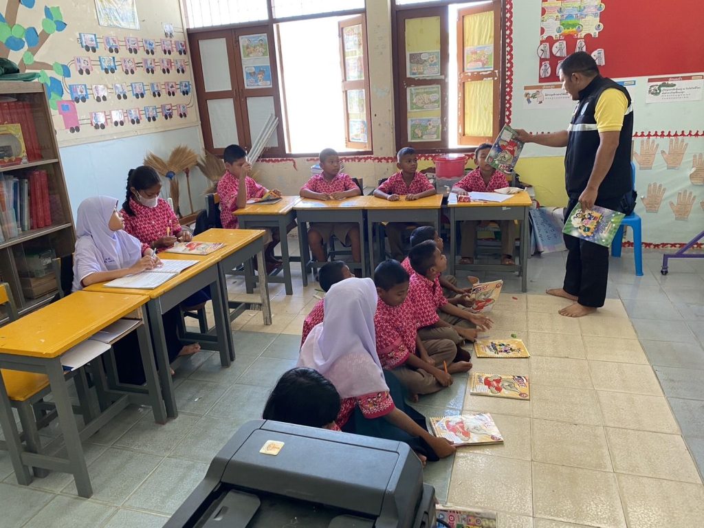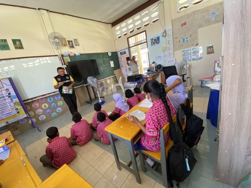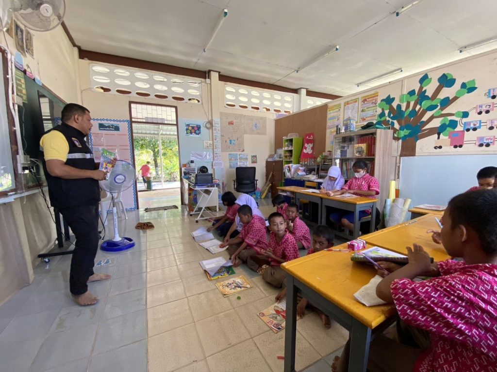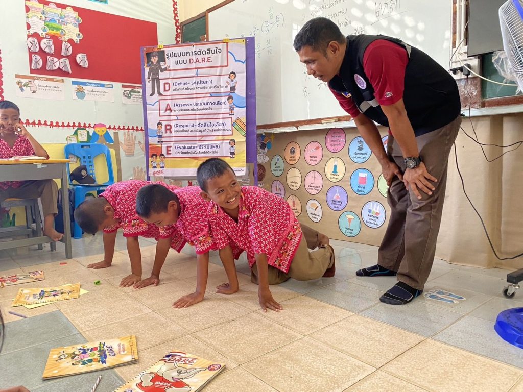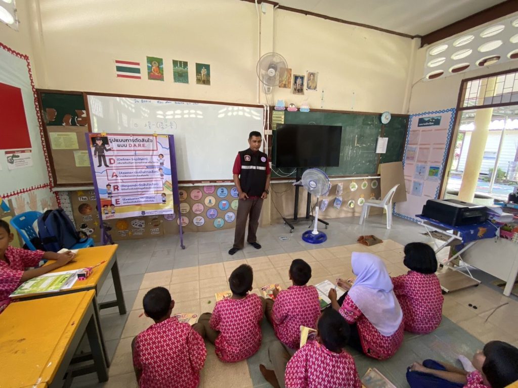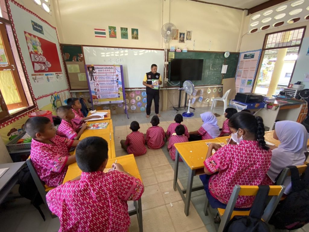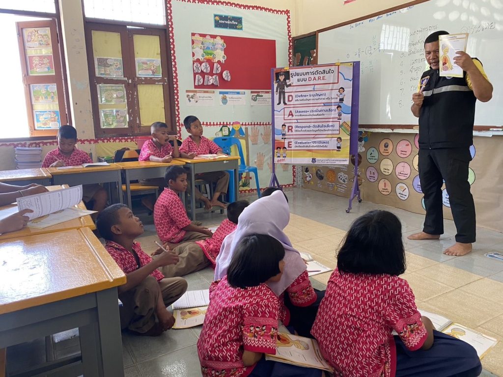 สอนนักเรียนตามโครงการการศึกษาเพื่อต่อต้านการใช้ยาเสพติด ในโรงเรียน ( D.A.R.E. )ณ โรงเรียนบ้านคลองทราย ม.7 ต.แม่ลาน อ.แม่ลาน จ.ปัตตานี