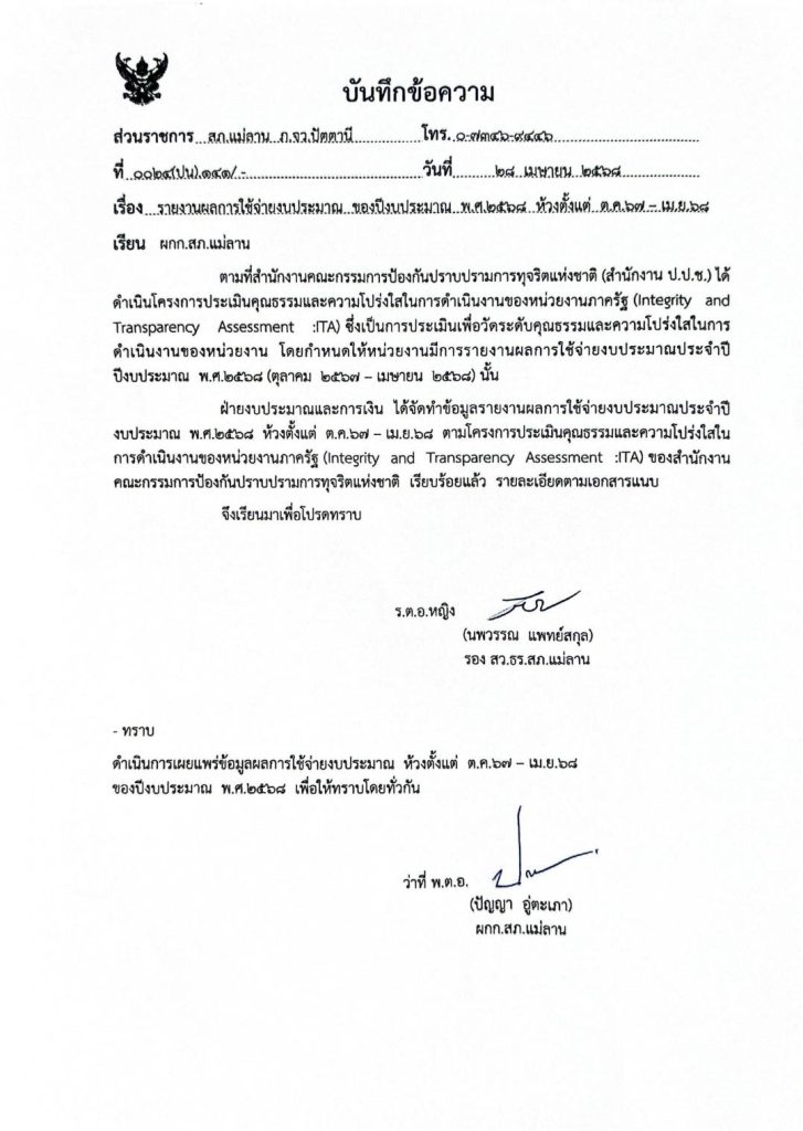 Home » มาตรฐาน ITA » การบริหารเงินงบประมาณ » 012 แผนการใช้จ่ายงบประมาณประจำปีและการรายงานผล